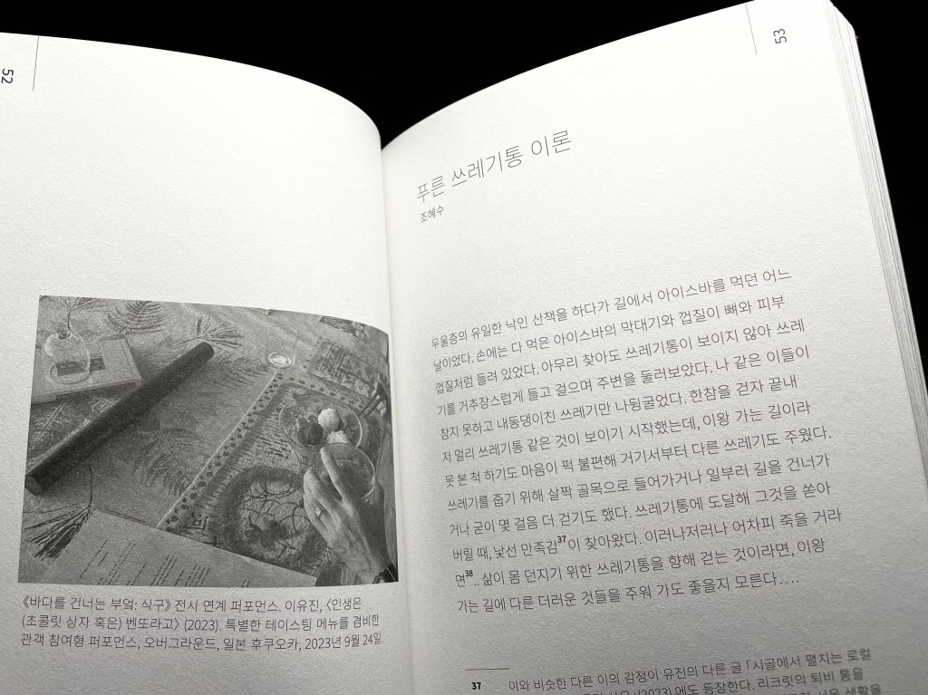 길 위에 흩어진 쓰레기들을 하나씩 주워 들고 걸으며 저자는 ‘푸른 쓰레기통 이론’이라는 문장을 떠올린다. 그것은 우울과 무력함 속에서도 무언가를 줍고 돌보게 만드는 충동이었고, 어쩌면 예술 실천이 시작되는 조건과도 닮아 있었다. 이 에세이는 그러한 감정과 사유에서 출발해 팬데믹 시기 클럽하우스라는 익명의 커먼 스페이스에서 벌어진 관계, 발화, 경청의 경험을 되짚는다. ‘문화예술 반말클럽 – 몰라 미술’이라는 실험적인 커뮤니티를 통해 말해지지 않았던 감각들, 예술을 둘러싼 위계와 검열, 바깥에 머물던 목소리들을 호출하며, 권력의 주변에서 예술을 구성하는 또 다른 방식에 대해 고민하게 된다. 이어지는 글의 흐름은 이유진이 참여한 제주와 후쿠오카를 잇는 전시 《바다를 건너는 부엌: 식구》로 확장된다. 리크릿 티라바닛, 이유진, 그리고 ‘미술관옆집’이라는 장소에서 벌어진 협업과 생활의 순간들은 쓰레기, 퇴비, 돌봄, 깨짐, 수습이라는 감각들을 따라 얽히고, 전시를 만들고 해체하는 과정 안에서 큐레이터라는 존재의 손과 마음, 그리고 여성성에 대한 질문으로 이어진다. 삶과 예술을 구분하지 않는 실천들, 무력함 속에서 벌어지는 돌봄의 장면들, 그리고 여성성과 큐레토리얼 행위 사이에 놓인 균열의 미학을 기록한 글이다.