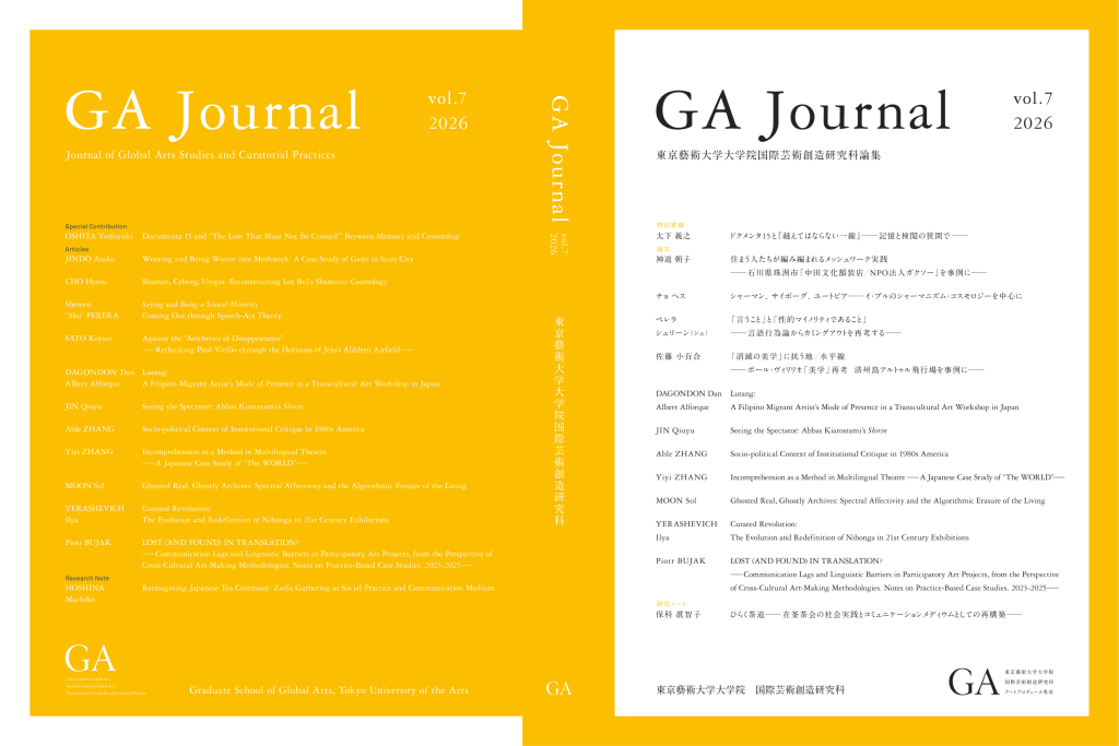 論文「シャーマン、サイボーグ、ユートピア──イ・ブルのシャーマニズム・コスモロジーを中心に(シャーマン、サイボーグ、ユートピア──イ・ブルのシャーマニズム・コスモロジーを中心に)」が、『『GA Journal 東京藝術大学大学院国際芸術創造研究科論集』(Journal of Global Arts Studies and Curatorial Practices)』第7号(2026)に掲載されました。