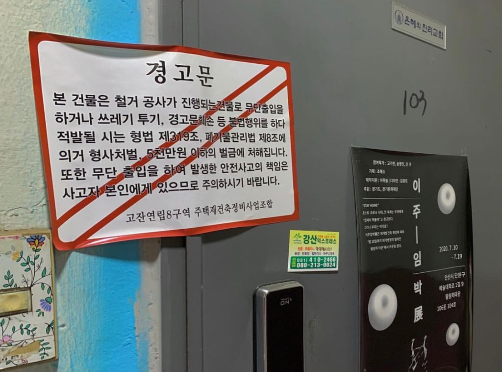 전시 이주임박은 7월 19일까지 전시 운영, 퇴거명령일인 20일에 암전 되는 것으로 예정되어 있었으나 고잔연립8구역 주택재건축정비사업조합(이하 조합)의 압력으로 인해 18일까지 공식 운영, 19일에 암전되게 되었습니다. 이에 이주임박은 더이상의 일요일 추가관람인원을 받지 않기로 결정하였습니다.